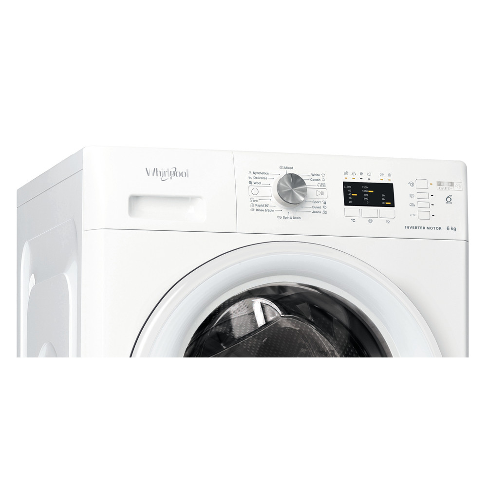 Specificatii masina de spalat rufe independenta Whirlpool: culoare alb. Eficienta cu 1200 rpm. Tehnologia Al 6-lea Simt, adapteaza in functie de incarcatura resursele necesare. Spalare rapida, in doar 30 de minute.
